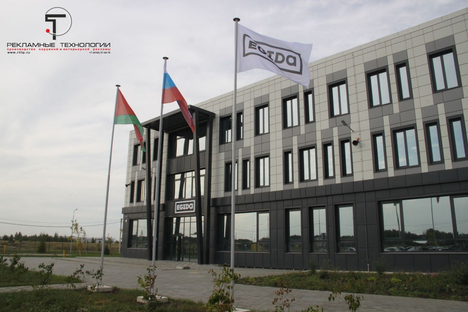 Перед офисным зданием завода EGIDA были смонтированы 3 флагштока и 3 флага: государственный флаг Российской федерации, флаг с гербом Липецка и флаг с логотипом EGIDA.