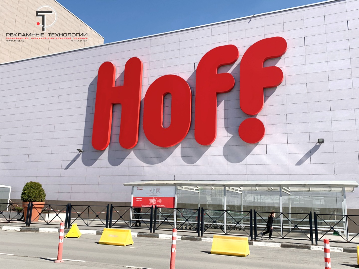 Изготовлена и смонтирована фасадная вывеска гипермакеркета "HOFF" на здании ТЦ "Акварель" (г. Волгоград). Крупногабаритная рекламная конструкция изготовлена из двухконтурного стального каркаса, который позволил использовать для лицевой поверхности баннерную ткань с аппликацией транслюцентной плёнкой красного цвета. Подсветка световых букв осуществляется светодиодными модулями красного свечения.
