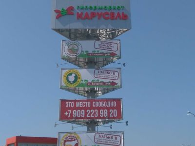 Летом 2016 года проведена комплексная реконструкция рекламных носителей гипермаркета "КАРУСЕЛЬ" по адресу: г. Липецк, ул. Гагарина, д.100-б. Крышная рекламная конструкция - была произведена замена неоновой вывески на светодиодную. Фасад торгового центра - произведена замена баннеров на световые короба размером 4х4м. с светодиодной подсветкой. Стела - на верхнем поясе стелы изготовлены и смонтированы новые вывески: на подложке из АКП световые буквы с светодиодной подсветкой.
