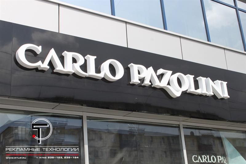 Один из лидеров российского обувного рынка Carlo Pazolini открывает новый магазин в Липецке, где представит огромный ассортимент качественной обуви и аксессуаров. Вывеска: глубокий контраст придают фриз, изготовленный из глянцевого черного композита DIBOND, и объемные световые буквы белого цвета.