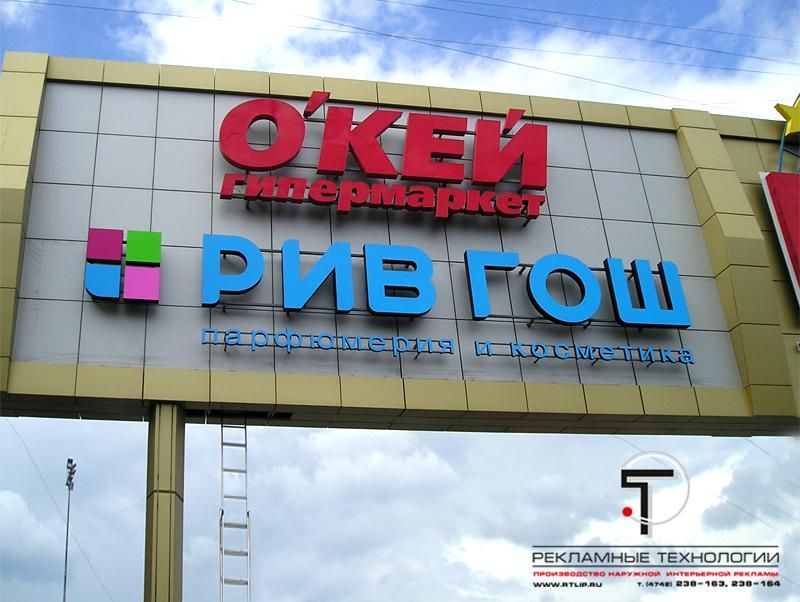 Для якорного арендатора РИВ ГОШ на центральных въездных воротах ТРЦ «Европа» осуществлен монтаж световой вывески. Лицевая часть объемных световых букв выполнена из акрилового стекла на фрезерно-гравировальном станке MULTICAM, а подсветка осуществлена с помощью светодиодных модулей ELF.