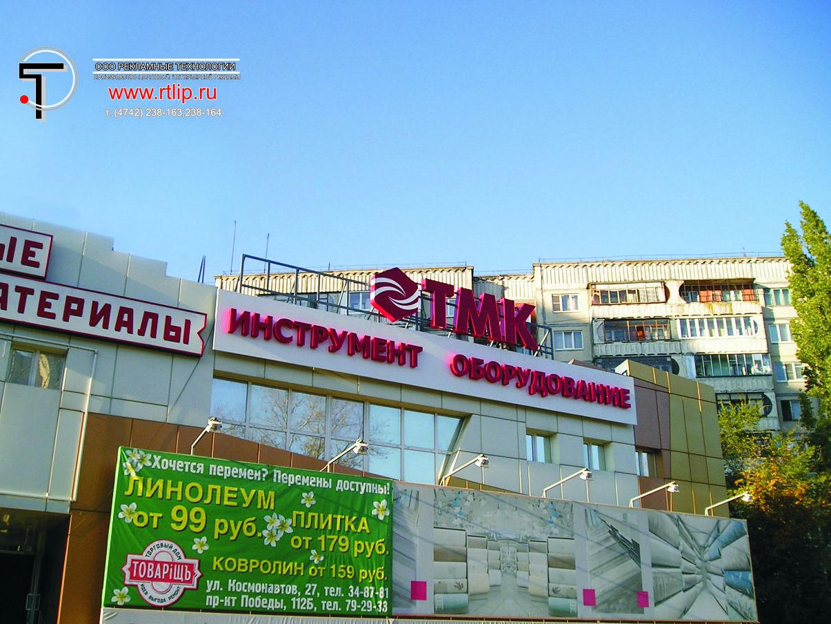 Ещё один магазин оборудования и инструментов «ТМК» открылся в Липецке. На здании установлена крышная рекламная конструкция. В буквах лицевая поверхность – красное акриловое стекло, подсветка – красная неоновая трубка красного свечения. Данное сочетание красных цветов обеспечивает вывеске яркость и хорошую видимость в тёмное время суток.