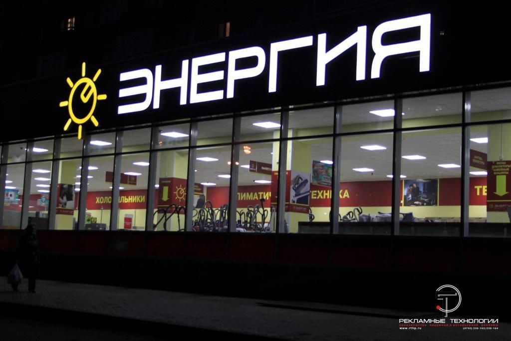 Осуществлена комплексная реконструкция фасада магазина бытовой техники и электроники "ЭНЕРГИЯ". Буквы выполнены из алюминия и цветного акрилового стекла. Срок службы более 10 лет. Светодиодная подсветка обеспечивает высокую яркость свечения и низкое энергопотребление.