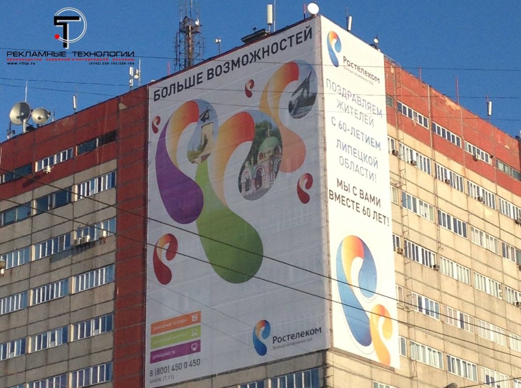 Ростелеком-Липецк обновил брендмауэр. Общая площадь рекламного поля составила 900м2.(Наружная реклама Липецк, Наружная реклама в Липецке, широкоформатная печать).
