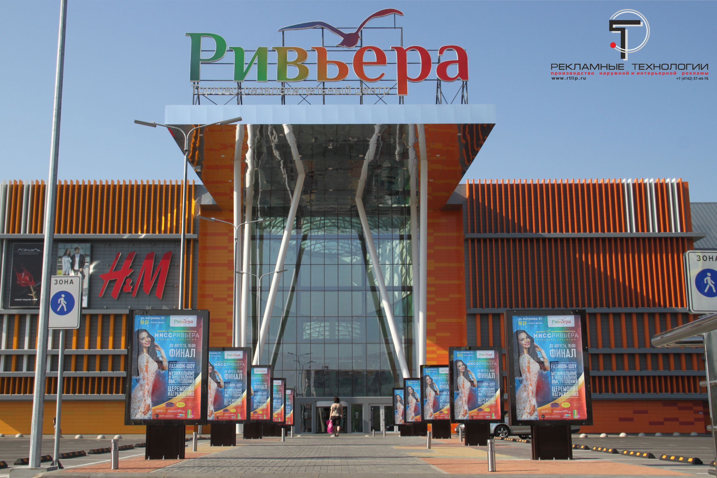 На пешеходной дорожке главного входа в ТРЦ "Ривьера" были успешно установлены новые рекламные конструкции (Изготовление наружной рекламы в Липецке). Рекламные конструкции представляют из себя СКРОЛЛЕРЫ - световые короба с размером рекламного поля сити-формата - 1,2х1,8м. В световые короба интегрирована система автоматической смены изображения скроллерного типа. На каждой поверхности могут экспонироваться до 5 рекламных плакатов. При изготовлении наружной рекламы в Липецке применялись алюминиевые профиля с долговечной порошковой окраской и вандалоустойчивое калёное стекло. Подсветка световых коробов осуществляется светодиодными модулями.