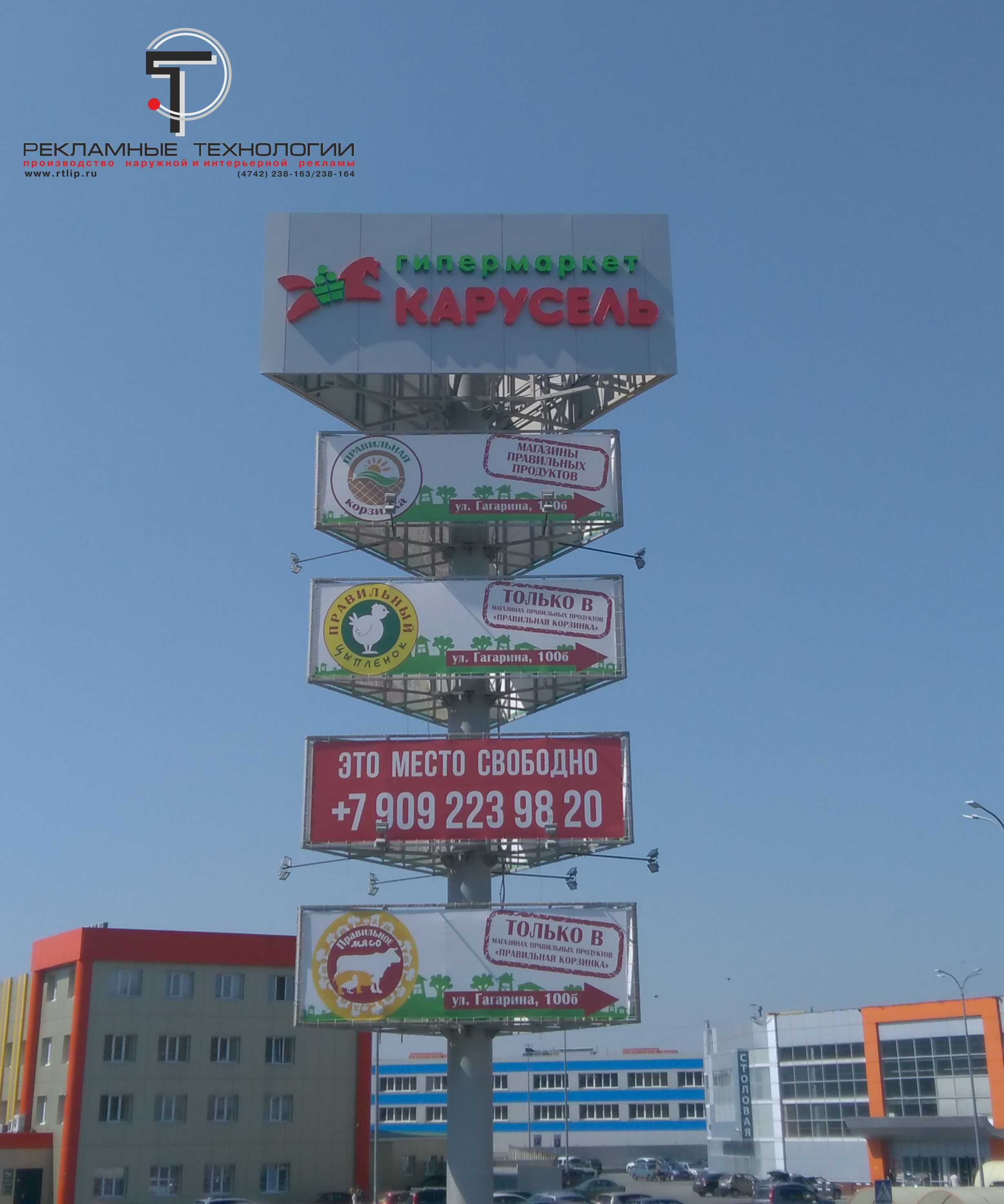 Летом 2016 года проведена комплексная реконструкция рекламных носителей гипермаркета "КАРУСЕЛЬ" по адресу: г. Липецк, ул. Гагарина, д.100-б. Крышная рекламная конструкция - была произведена замена неоновой вывески на светодиодную. Фасад торгового центра - произведена замена баннеров на световые короба размером 4х4м. с светодиодной подсветкой. Стела - на верхнем поясе стелы изготовлены и смонтированы новые вывески: на подложке из АКП световые буквы с светодиодной подсветкой.