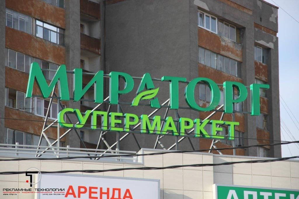 Новая сеть качественных супермаркетов МИРАТОРГ открывается в Липецке. (Наружная реклама в Липецке) Отличный выбор качественных продуктов, большой ассортимент и качественные продукты гарантированы. Первый магазин планируется открыть в ТЦ "Квартал. Вывеска на основе световых букв уже привлекает покупателей.